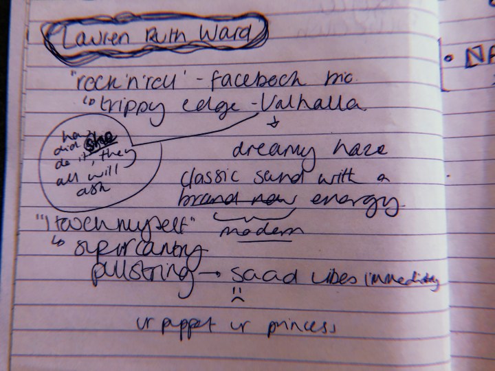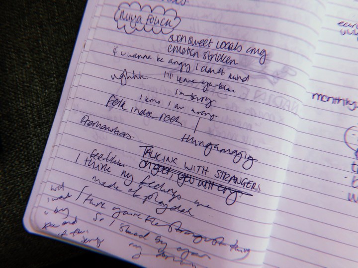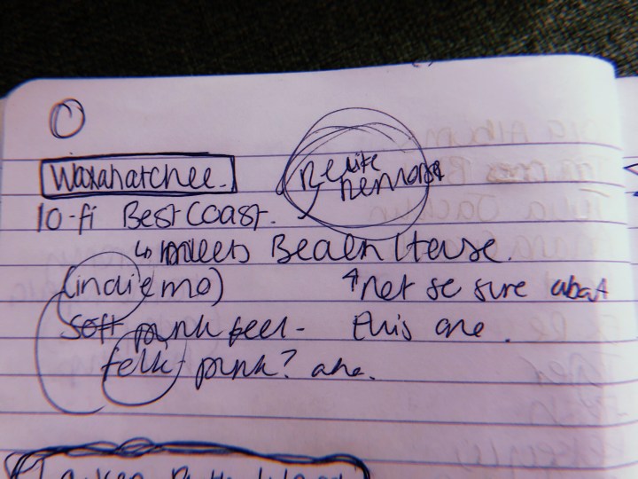 Initial notes: such sweet vocals omg, emotion stricken *various lyrics scribbled down*, Talking With Strangers – Oh god you will cry”, ughhh, folk indie rock